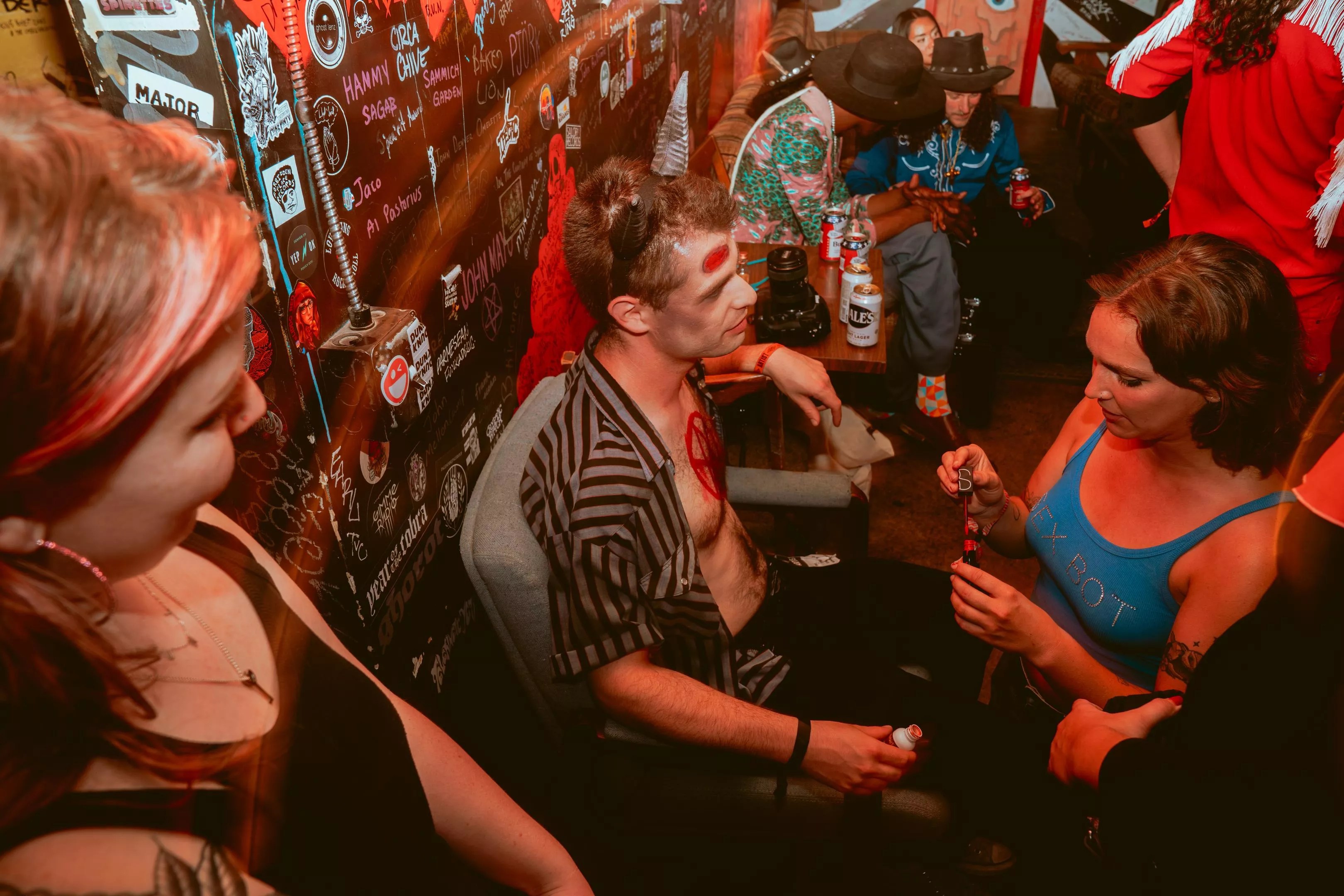 Our highlight on Saturday came with Mr. Knobs, an indefinable four-piece that had the hi-dive crowd mesmerized and moving. Fronted by vocalist “Mister Knobs,” the band includes fiddle, bass, guitar and drums, and alternates between ethereal and heavy, with mind-bending exchanges between the fiddle and vocals. After leaving our brains on the floor, we were then carried away by the rugged blues rock of Shady Oaks, which took over the stage for a raucous set that included frontman Ty Gallaway storming the crowd while shredding the guitar. And the crazy didn’t stop there: Rootbeer Richie was on next for the secret set, with a line around the venue of fans eager to get in.