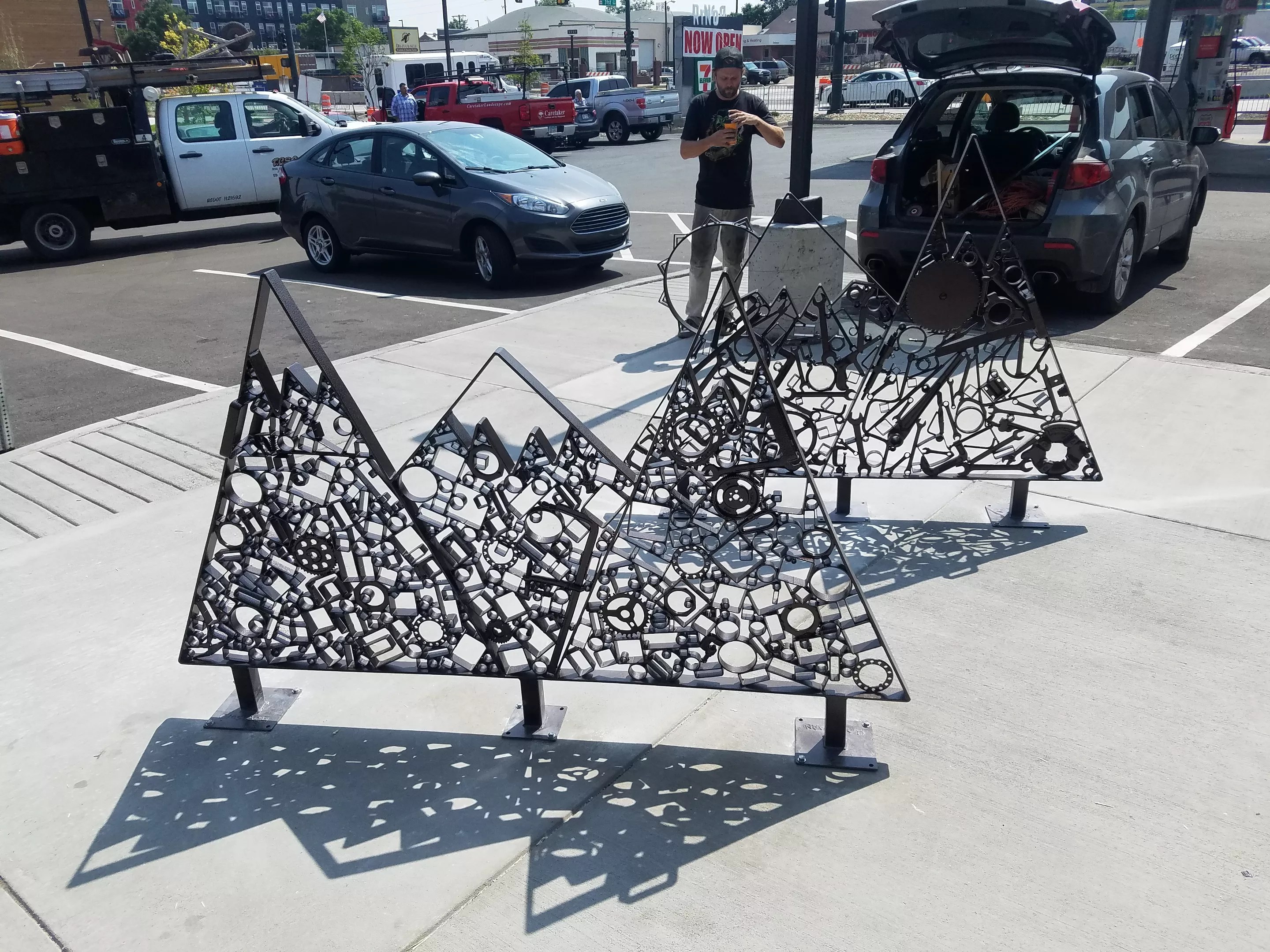 Some of the newly installed artisanal bike racks at 31st Street and Brighton Boulevard.