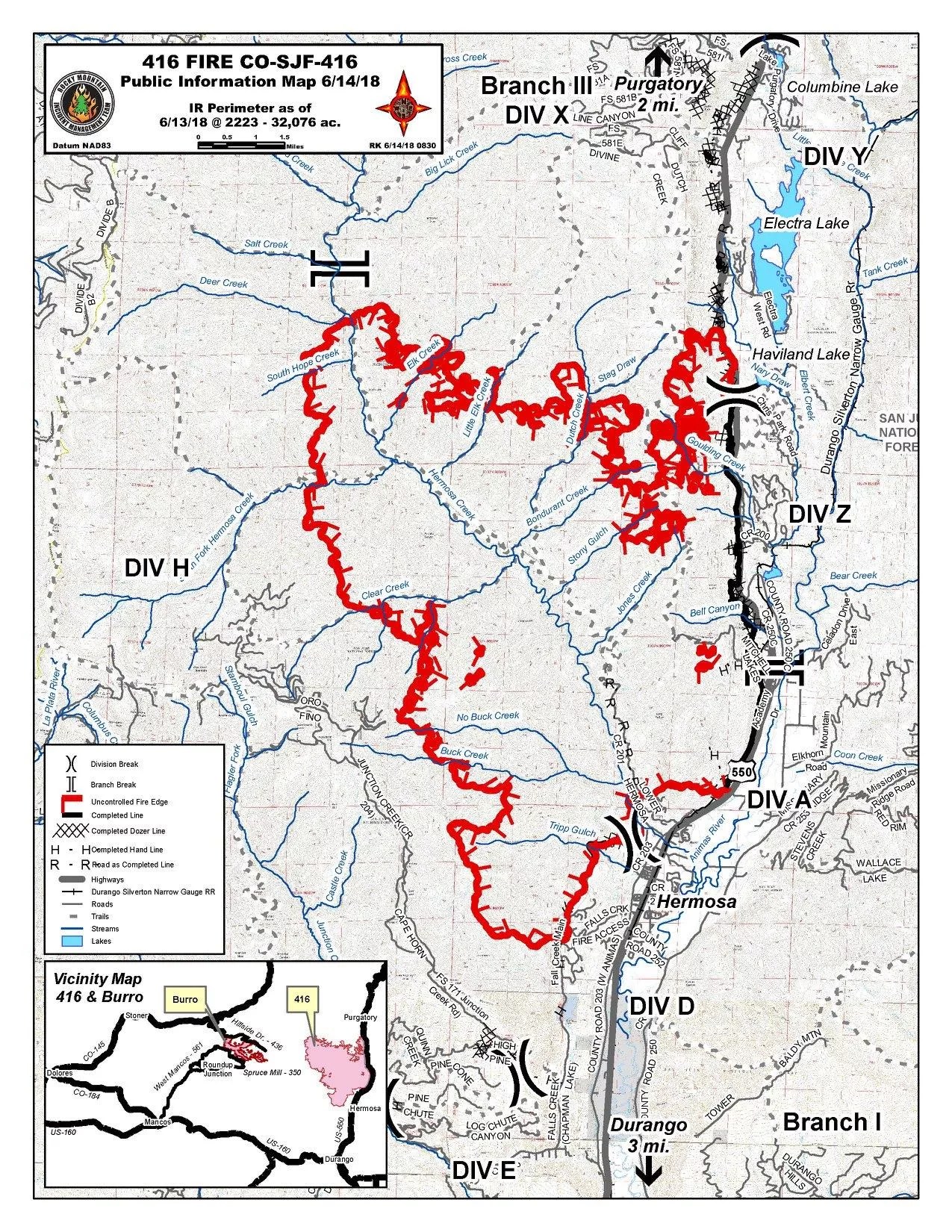 Below is the latest map of the blaze in the San Juans. Though Governor John Hickenlooper tried to reassure tourists on Wednesday that it is still safe to travel to Durango, the fire is within thirteen miles of the city as of today, June 14. According to the latest report, 24 fire crews, 55 engines, eight bulldozers and twelve tankers are fighting the blaze.