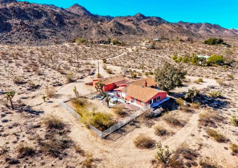 Fantastic acreage & view property near entrance to Joshua Tree National Park. Perched smartly on 2.5 acres, with commanding views in all directions, this 3 bedroom 2 bath home checks all the boxes! Over 1700 square foot of living space, fun floor plan, hip decor with tiled flooring, rock fireplace, Ikea kitchen, yoga / astronomy room, open and airy-the photos say it all! Currently being used as short-term vacation rental, produces good income…perfect for the person looking for a desert get-away but would like rental income also. Separate garage building with 1/2 bathroom and storage (could be artist studio) beautiful yard with hot tub spa-fenced for the pups and kids, tranquil water feature, impressive Saguaro cactus-too many things to mention. Solar panels on southern roof complete the package. Minutes from the the groovy downtown Joshua Tree scene and right next to park entrance, hiking trails right outside the door. Don’t hesitate on this one! Come see today.