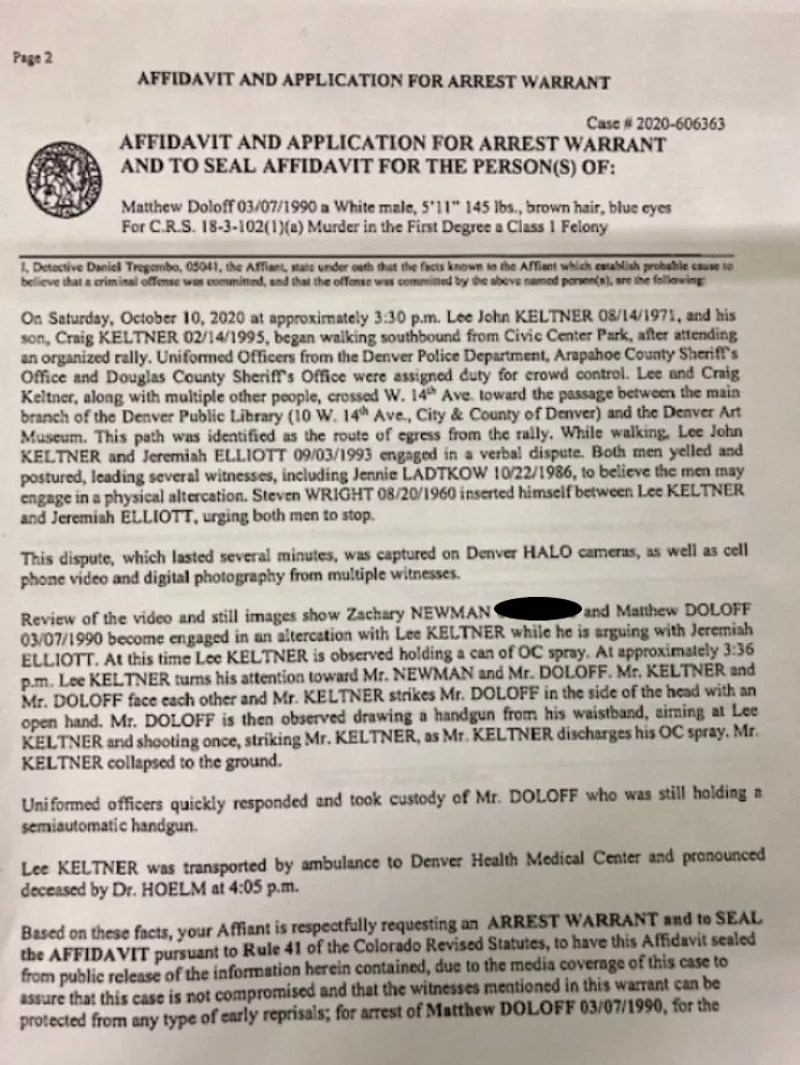 The protester had previously been identified in numerous news reports as Jacob Kelly. But while his name has been removed from the Denver Police Department’s probable-cause statement on Dolloff’s arrest provided to media outlets on October 13, an unexpurgated version that managed to slip out earlier names him as Jeremiah Elliott, as seen below. (Note that Dolloff’s name is misspelled throughout the document.)