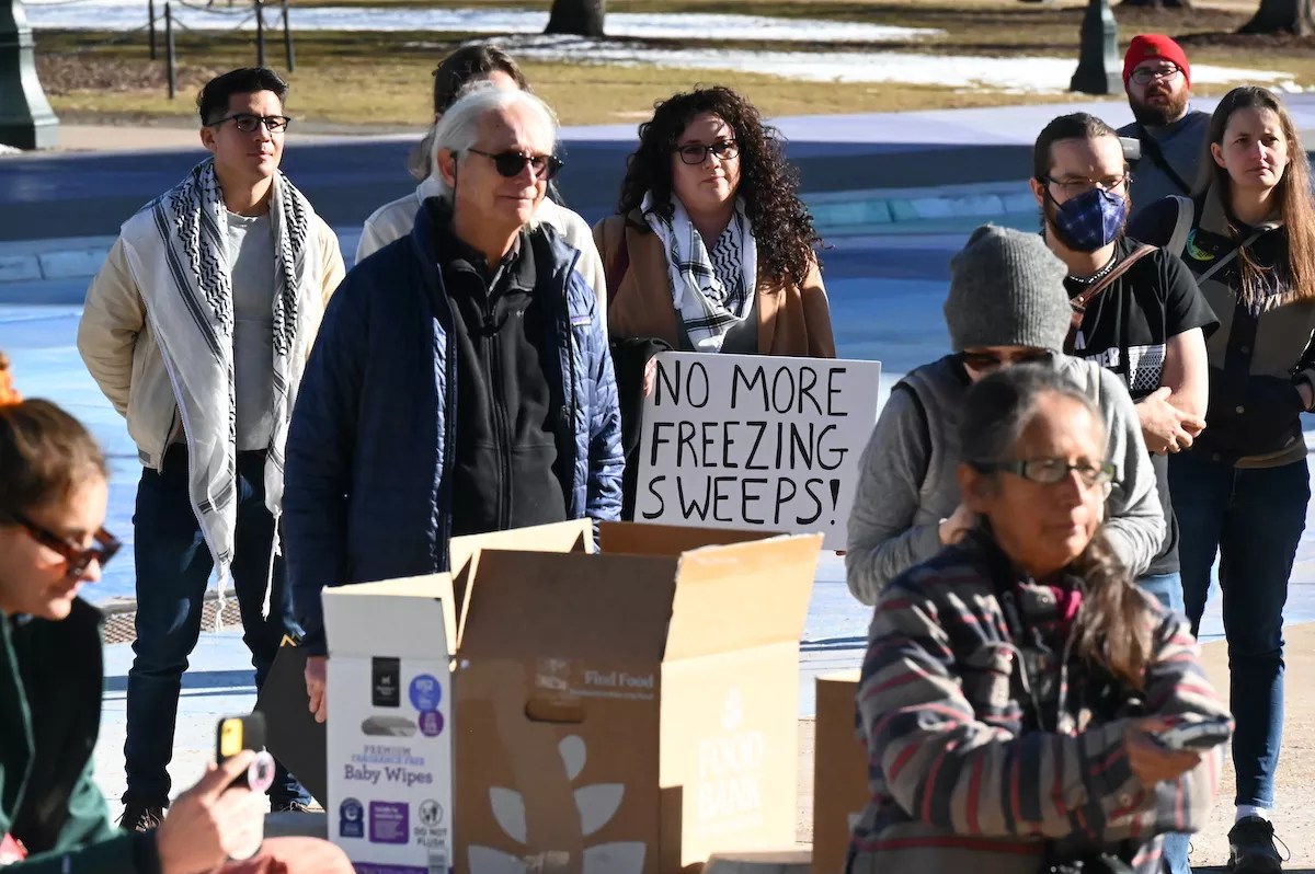 A rally outside City Hall pushed for the “No Freezing Sweeps” bill.