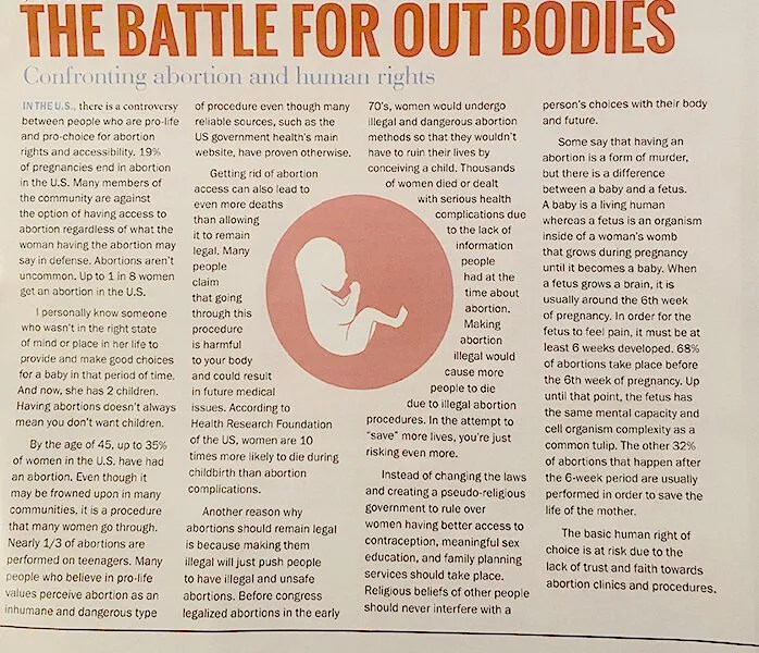 I personally know someone who wasn’t in the right state of mind or place in her life to provide and make good choices for a baby in that period of time. And now, she has 2 children. Having abortions doesn’t always mean you don’t want children. — Editorial in a now-erased Elevate, Regis Jesuit High School student publication