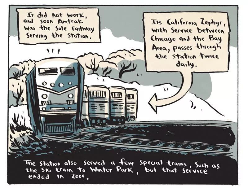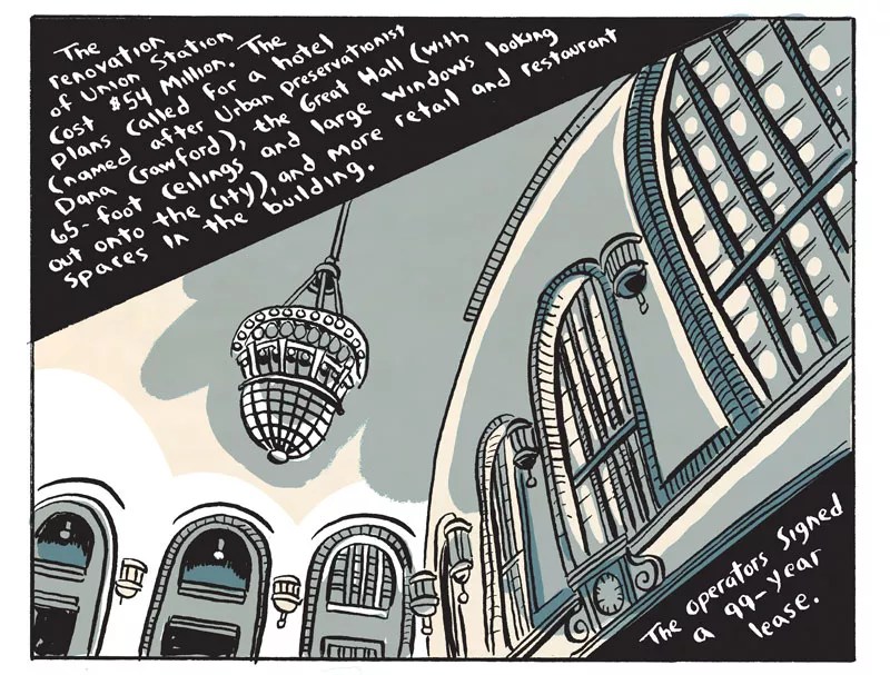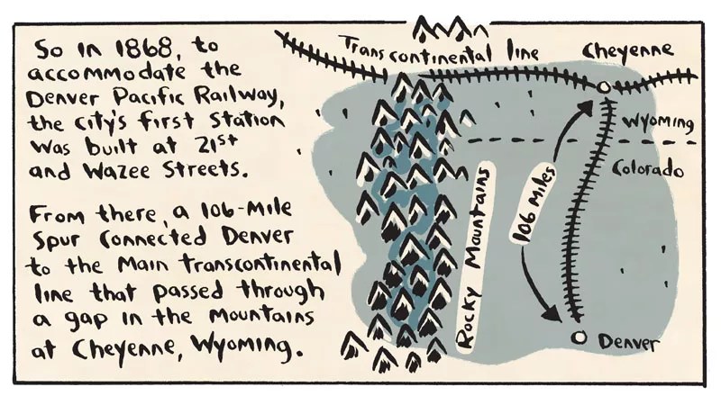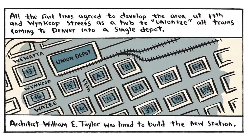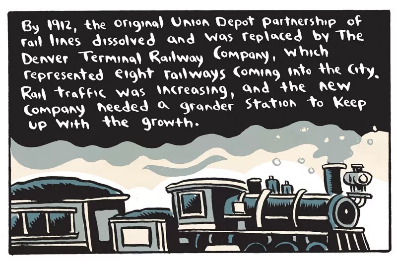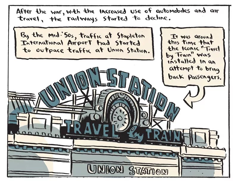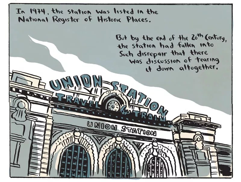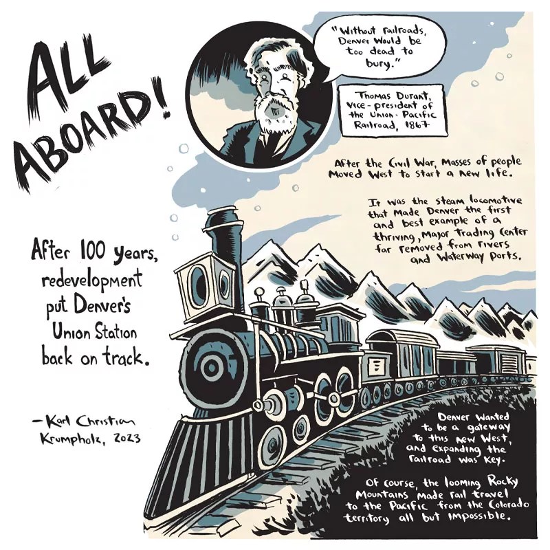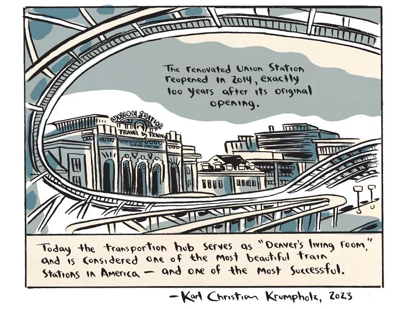 Cartoonist Karl Christian Krumpholz has been exploring Denver and then sharing his discoveries with the city for years. This time, he’s taking us on a ride through the history of Union Station, a vestige of Denver’s past that underwent a massive renovation that transformed it into a multi-modal transportation complex a decade ago.