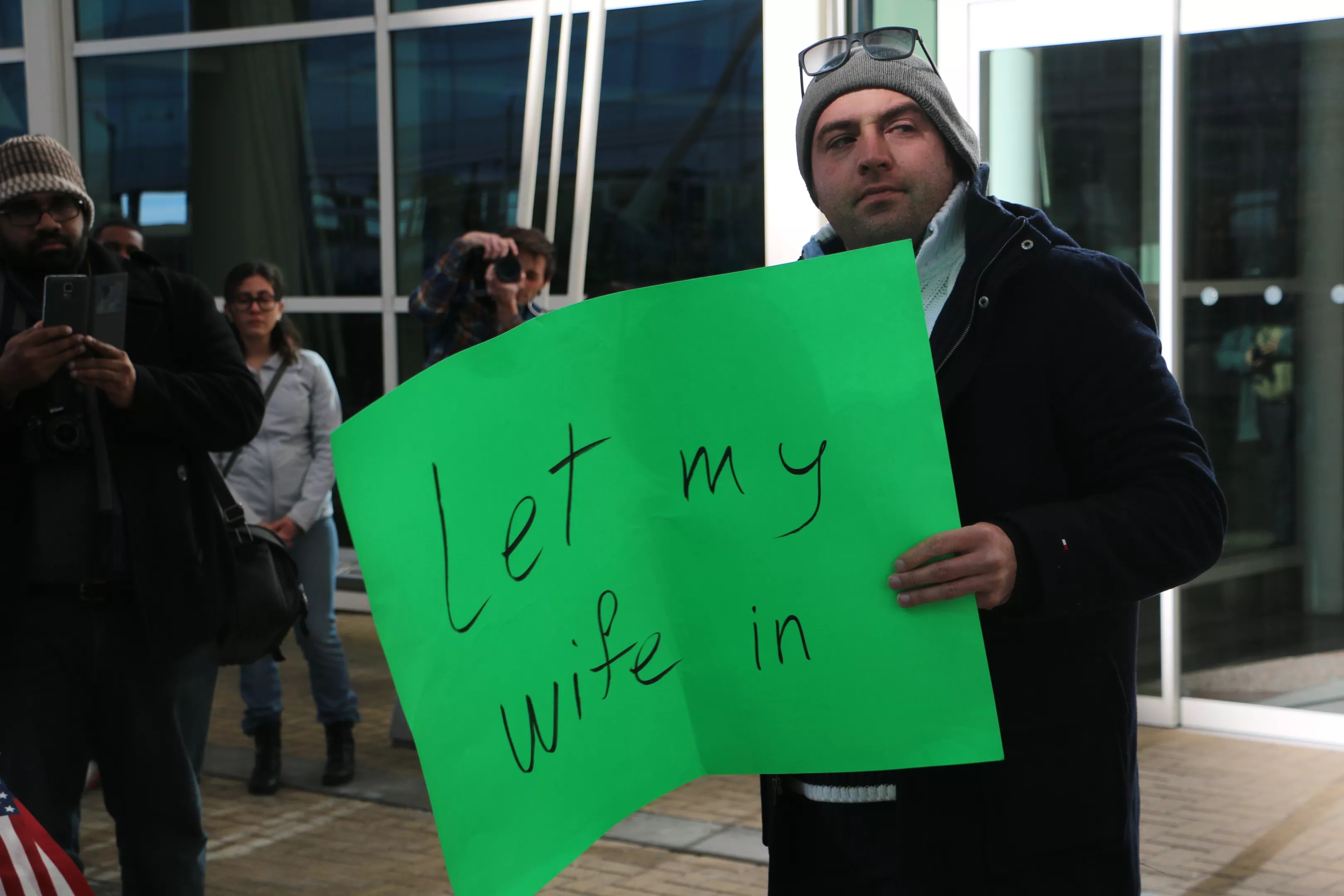 Vali arrived on the plaza carrying a green poster-board sign that stated, “Let my wife in.” When demonstrators saw him, they chanted in unison, “Let his wife in.”