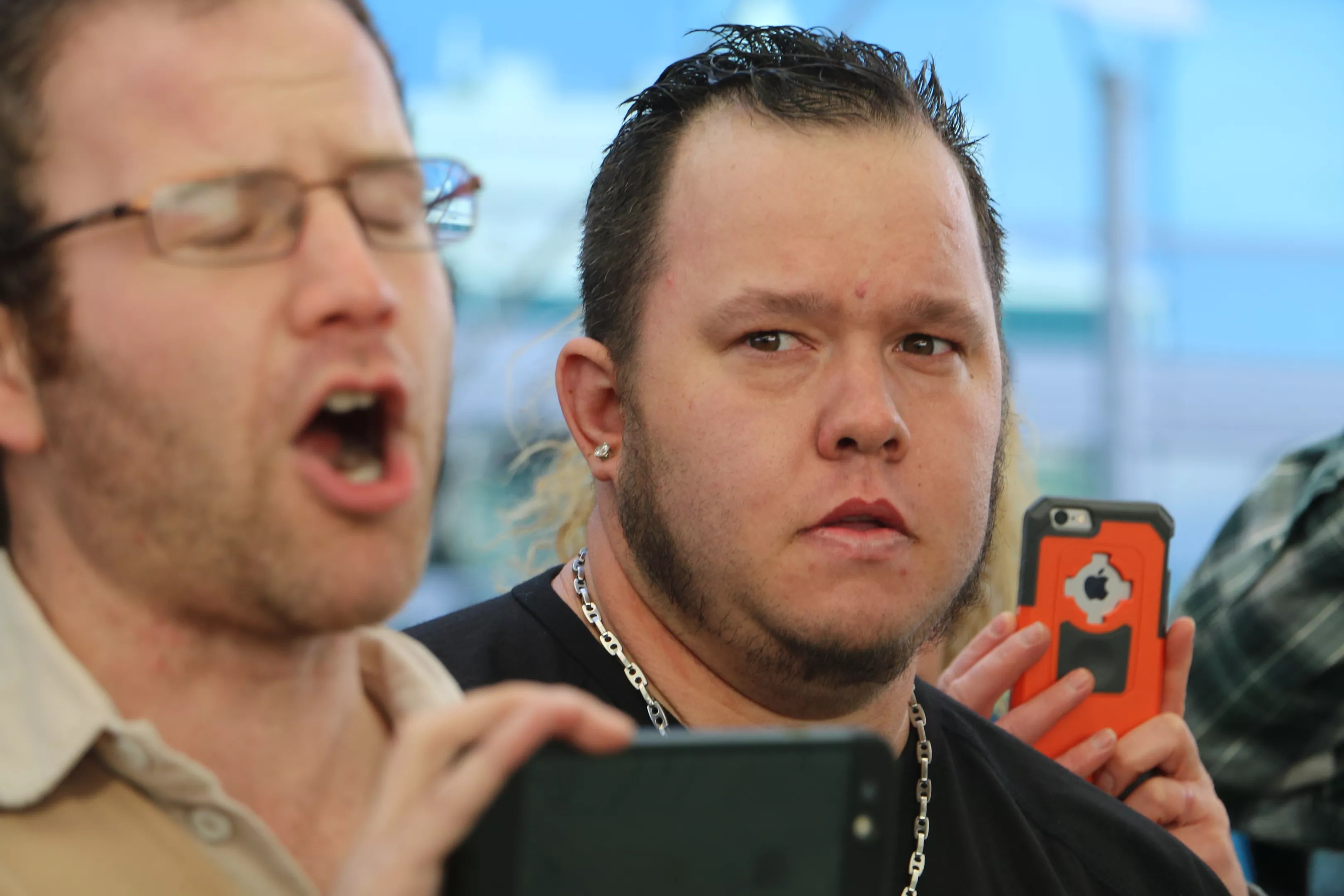 As passengers came and went from the airport, some grinned, others snarled. One chanted, “Build the wall!” and shot the bird at the demonstrators. Many, including airline employees, applauded the crowd, raised peace signs and chanted along. A few, luggage in tow, joined the rally. Most looked straight ahead and tried not to acknowledge the loud chants.