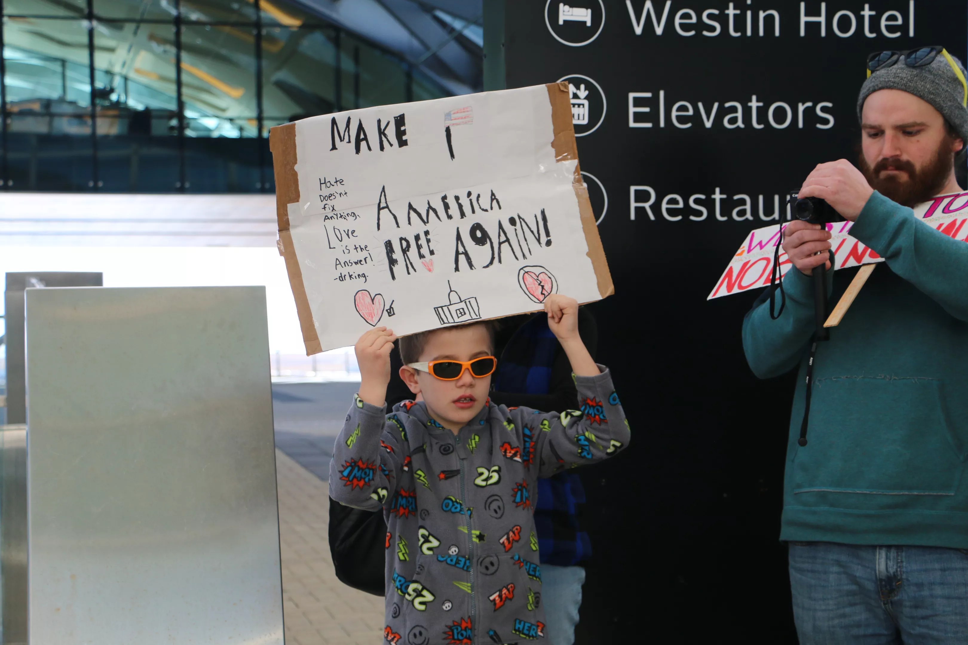 The Sunday protest at DIA had a patriotic tone, as protesters touted their vision of the United States over the Trump administration’s.