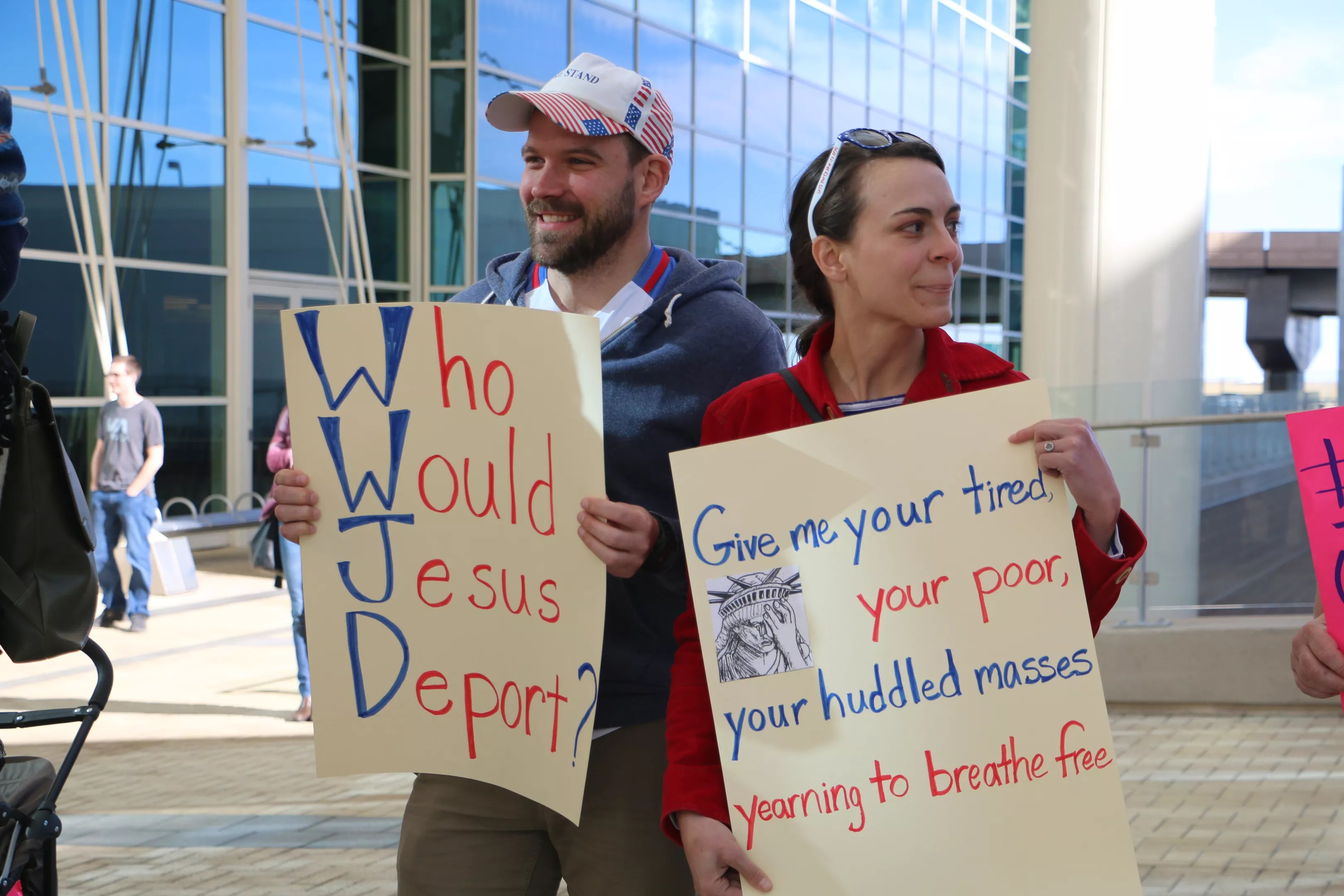 While Saturday’s protest at DIA was led by Muslims who presented an optimistic vision of the United States, Sunday’s was organized by a white ally. At both events, protesters were patriotic and deeply dissatisfied with the Trump administration, which many called “un-American.”