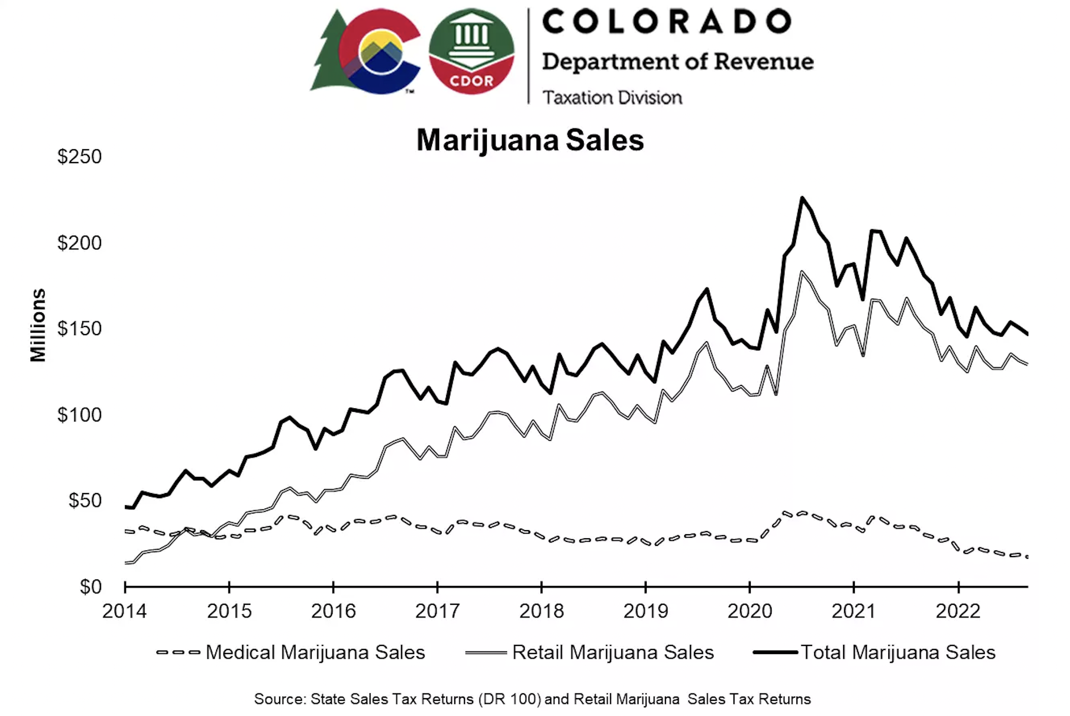 After hitting $2 billion in 2020 and topping over $2.2 billion in 2021, Colorado dispensary sales will be lucky to break $1.8 billion in 2022. Through September, overall marijuana sales for the year were just under $1.36 billion, according to DOR data. If dispensaries continue to meet their latest six-month average of $149.7 million in sales per month, then the 2022 marijuana sales total would barely break $1.8 billion — and that’s a big if, considering the lower-than-average numbers that dispensaries tend to experience in winter months.