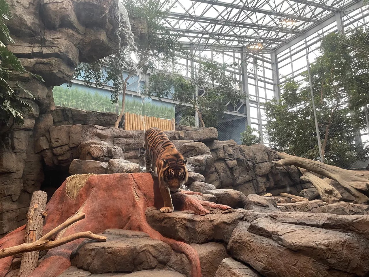 Indeed, Jalen, one of the tigers, loves naps more than any other activity, according to a handwritten sign. As he makes his way around the enclosure, he walks rather than runs, plodding in a repeating circuit around the enclosure — which might actually be the size of a small house. Still, despite his unhurried pace, his journey only takes about three minutes per lap.