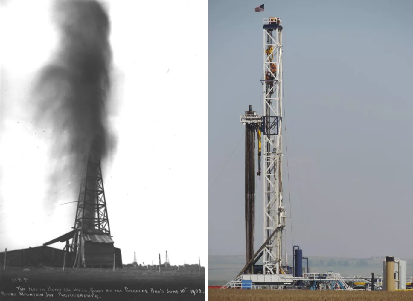 Oil was first produced from the Denver Basin on a ranch outside of Boulder in 1902 (left). A modern rig drills for oil and gas in Weld County, where there are more than 30,000 active and abandoned wells.