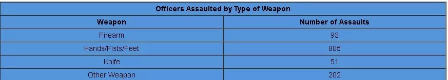 Still, the simplest kinds of weapons – those already attached to our bodies – accounted for the greatest number of assaults by far. On 805 occasions, officers were attacked by suspects who used their hands, fists or feet.