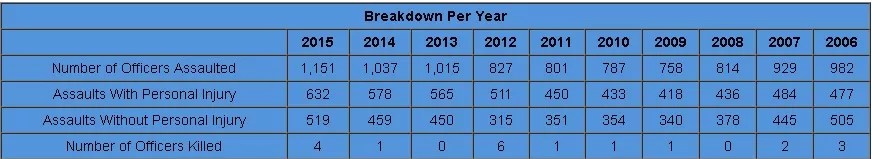 The first graphic breaks down assaults against officers over the decade stretching from 2006 to 2015. The first two years of that span saw more than 900 attacks on cops. After that, the digits dropped into the 700 and 800 range for five years before jumping over 1,000 in 2013 and rising each of the next two years, topping out at 1,151 in 2015.