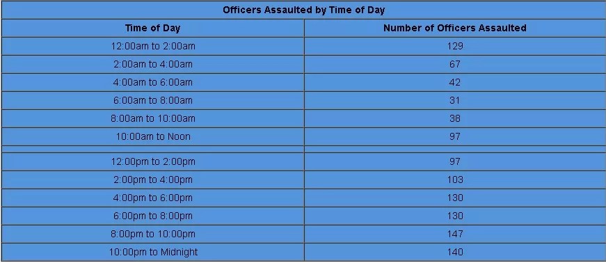 The dangers increase beginning in the late afternoon. The stats show that 130 assaults on officers occurred between the hours of 4 p.m. and 6 p.m., with the same number taking place from 6 p.m. to 8 p.m. before reaching their apex of 147 in the 8-10 p.m. period.
