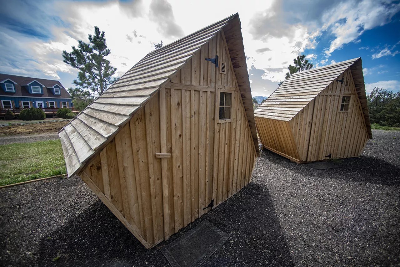 The Petersons decided to go that route, building two cedar huts shaped like irregular pentagons. The cedar contributes to the aroma in the huts, though Charlie says it was selected for durability in the Colorado weather. Another Carolyn Craigslist find contributed to the huts’ unique shape: She discovered Joe McCartney, who lives in Hudson and builds saunas and sheds in that shape. McCartney created customized structures that include a spot for the hives.