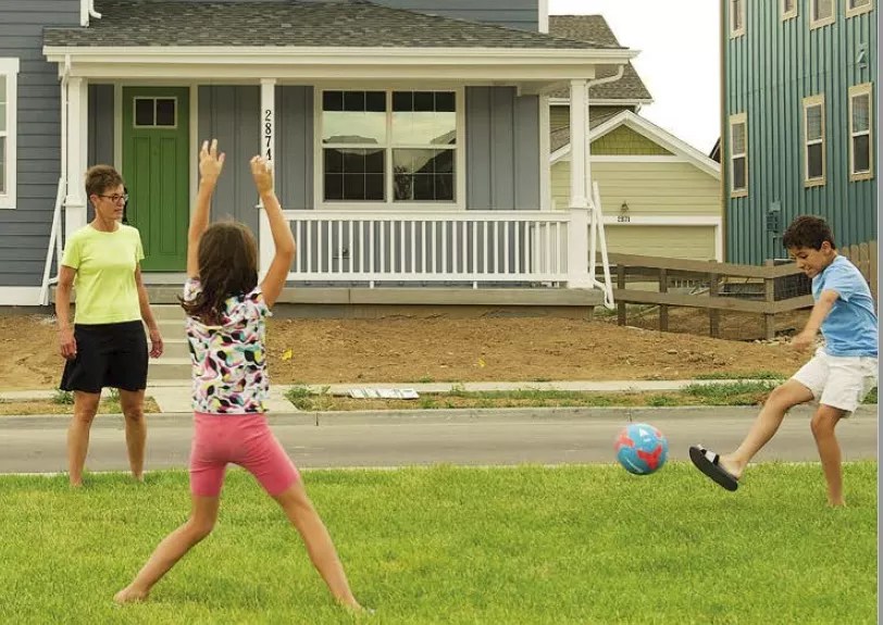 Sharon Collinge with kids Savannah and Jacob in front of their new home in Lafayette.