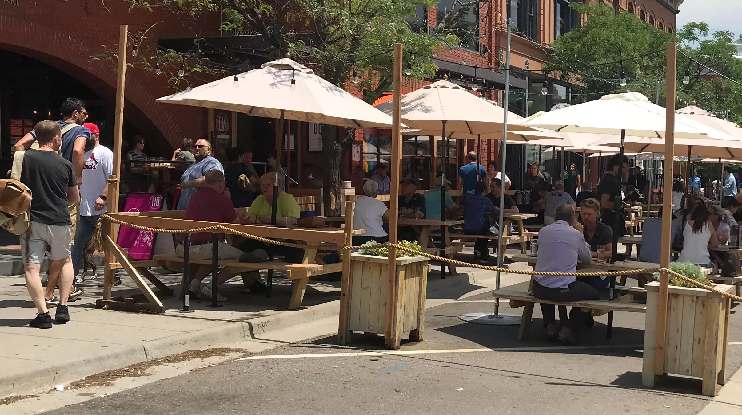 Outdoor seating and street closures instituted during the pandemic remain in place on the Pearl Street Mall.