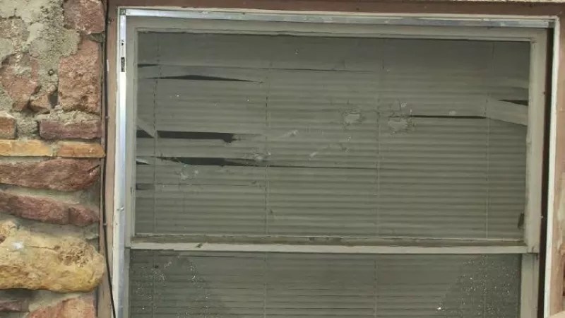 A Boulder police photo of the bullet-riddled living-room window of Cole Stewart’s apartment as shared in the motion to dismiss the charges against him.
