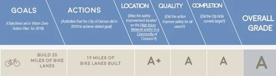 The report card looks at eight major Vision Zero components and grades the city’s progress toward its goals in four categories for each. The “Actions,” “Quality” and “Completion” groupings are self-explanatory, while “Location” refers to where projects were based, with Denver typically downgraded if they were outside what’s been designated as the “high-injury network” or a so-called “community of concern.” The former consists of what van Heuven calls “the 5 percent of the street network where 50 percent of the fatalities happen.” (Major arterials such as Colfax Avenue, Hampden Avenue, Alameda Avenue, Federal Boulevard and Colorado Boulevard are all on the list.) The latter are neighborhoods where a lack of infrastructure makes alternative forms of transportation such as walking or cycling difficult; they include Montbello, Green Valley Ranch, Globeville, Elyria-Swansea and suburban areas in southeast and southwest Denver.