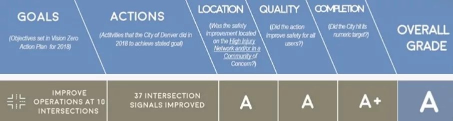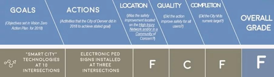 The Denver Streets Partnership has issued a report card for 2018 in regard to Vision Zero, an action plan launched by Mayor Michael Hancock that aims to eliminate traffic deaths in the Mile High City by 2030. And while there are some bright spots, the overall mark of “C” is no one’s idea of a triumph.