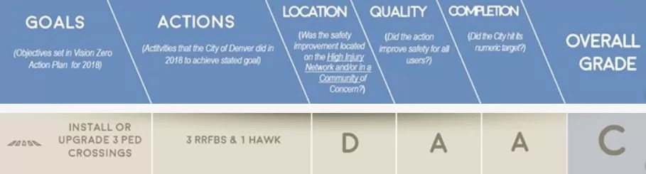 “A HAWK signal was part of the Brighton Boulevard redesign; it was put at Brighton and 35th, which is a good location with all of the redevelopment happening in the area. But Brighton didn’t pop up as a street in the high-injury network. And they did put a flashing beacon in the Montbello location. So we’re allowing them to count something twice – but we still gave them a D for location.”