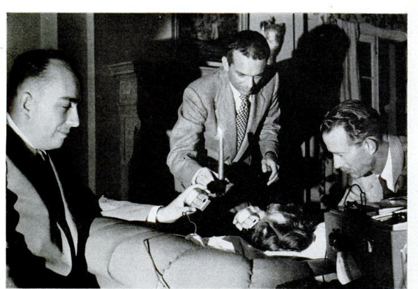 In a publicity photo, Morey Bernstein (center) re-enacts putting Ginni Tighe in a trance using a candle; Joe Bullen (left) was one of the witnesses who helped record the sessions.