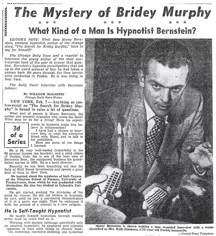 “Every single item that attacked Bridey was torn to shreds,” Bernstein insisted, “while even the most recondite facts that Bridey gave forth during hypnosis were 100 percent correct.”
