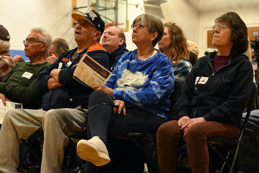 (From left) David Medina, Valerie Fresquez and Dolores Garcia take in a presentation by the Broncos about the team’s move to La Alma.