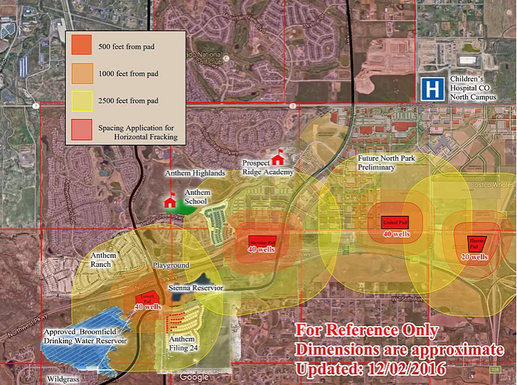 Opponents’ rendition of Extraction’s proposed well pads, superimposed on a Google Earth map to show proximity to Broomfield residential areas.