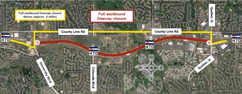 As for alternate eastbound routes overnight and through the course of the weekend, CDOT advises drivers to exit at University, head north to County Lane Road, then turn right and continue to Quebec. Another right will lead back to C-470. Estimated detour length: four miles and six to eight minutes of additional drive time.