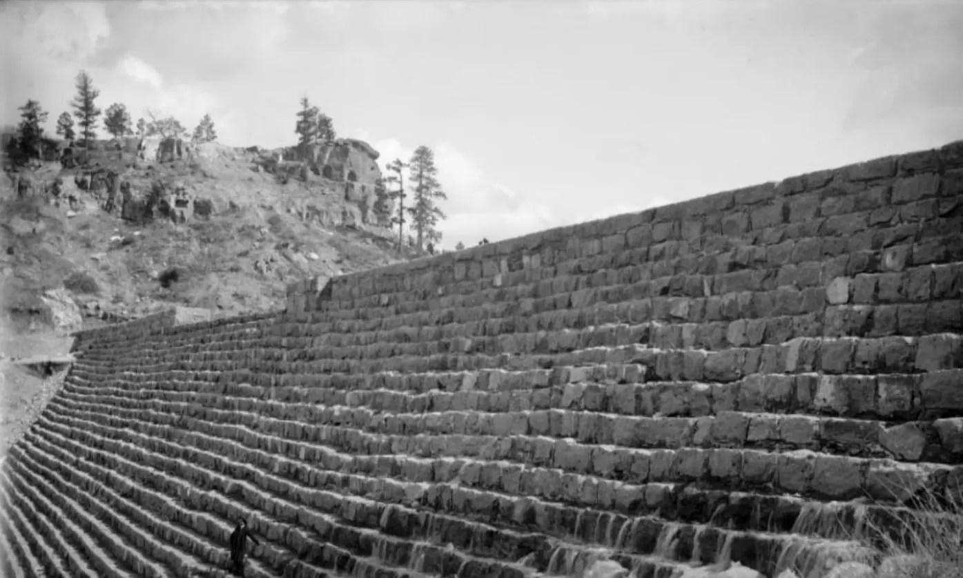 The potential for that profit is what had brought the dam into being: The project was the concept of the Denver Water Storage Company, in partnership with Denver Land and Water, two of many hydro-pioneers that would give way in 1918 to the municipal entity still called Denver Water today. Back then, they figured that if they built it, farmers and businesses would come — and they were right. The dam itself was designed by chief engineer A.M. Welles and constructed in a rock-fill strategy composed of two freestanding walls: a straight wall on the reservoir end and a stepped wall on the other. It was built entirely by hand by over 300 men and 180 teams of horses over 11 months; when finished, it was 600 feet across, 70 feet tall, 8 feet thick at its top and 50 feet deep at its base.