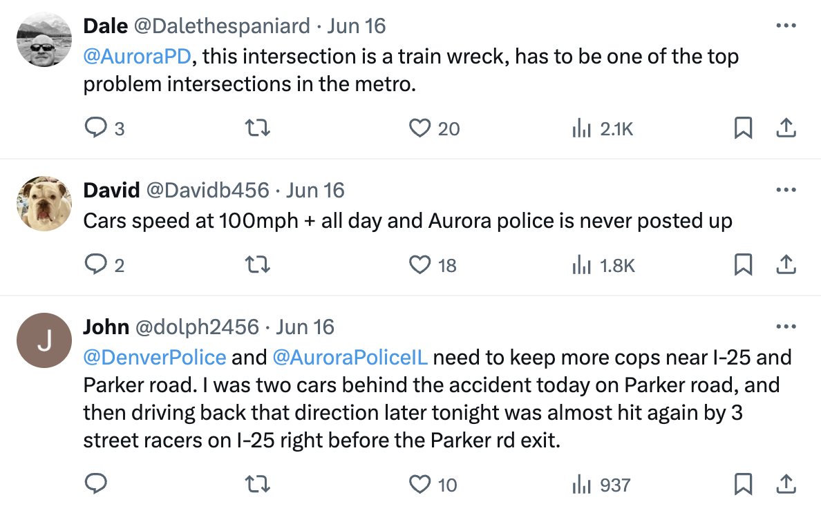 While it was unable to provide specifics, Brown says Aurora’s Traffic Engineering division conducted a review of the last three years of crash data at the intersection — screening for “correctable patterns” — and found that there is just one crash per month there on average.