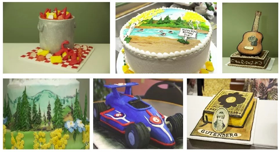 A collage of photos displaying custom creations from Masterpiece Cakeshop.