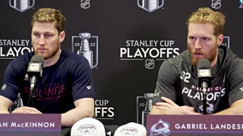 Nathan MacKinnon and Gabriel Landeskog during a post-game interview.