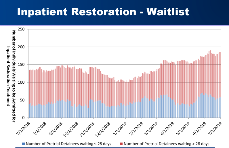 As of last March, the average wait time in jail before getting admitted for competency restoration was still 79 days. And as of the beginning of July, there was still a waitlist of over 150 people, most of whom have already been waiting longer than the legal limit. As of July 1, 2019 there were 208 patients at the state hospital for restoration treatment.