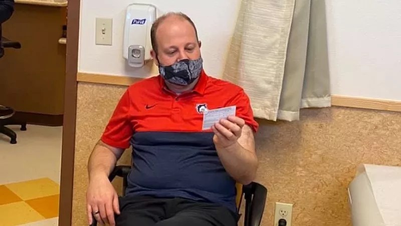 Governor Jared Polis awaiting his first COVID-19 injection on January 30 — and wearing his mask a bit lower on his nose than is strictly advisable.