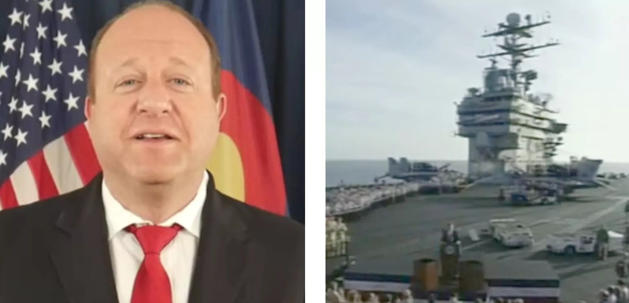 Governor Jared Polis announcing the end of public-health orders against COVID-19 on July 8; then-President George W. Bush delivering his 2003 "Mission Accomplished" speech from the aircraft carrier USS Abraham Lincoln.