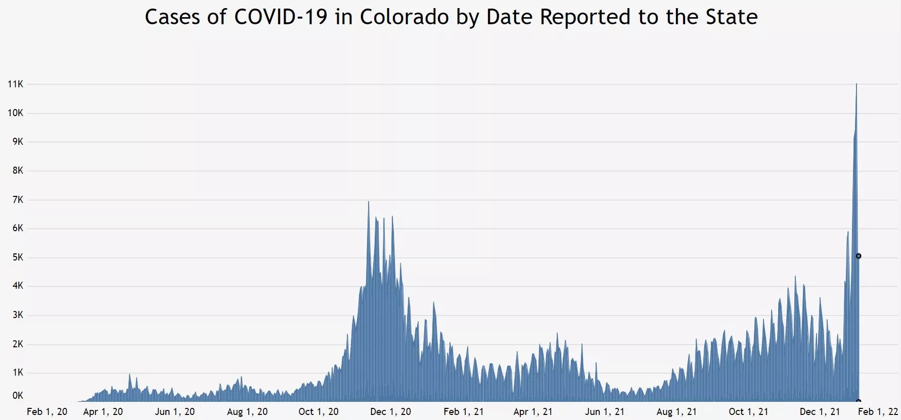 The latest update about COVID-19 from the Colorado Department of Public Health and Environment provides an early look at the holiday impact of the Omicron variant, confirming Governor Jared Polis‘s mid-December prediction that it would become the dominant strain in the state. But while cases have ballooned in a stunning manner, new hospitalizations are not yet mirroring the increase.