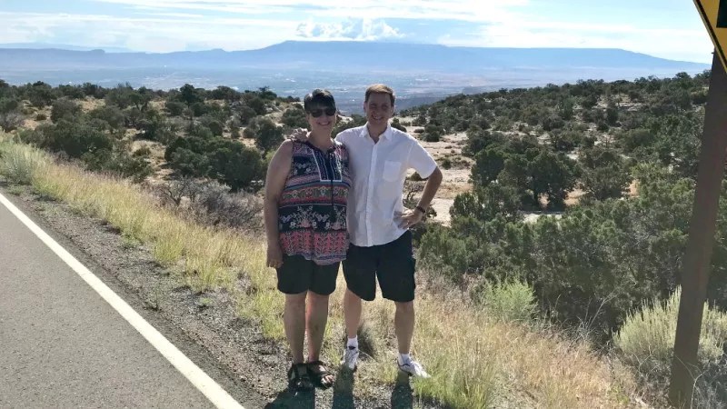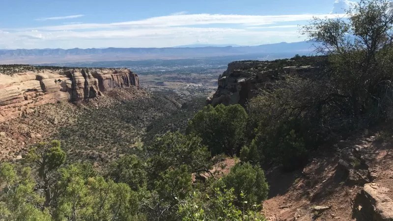 The following morning, Deb and I decided to travel over the Monument in order to marvel at how we’d managed to survive those moronic summer nights during our teens when we’d zoomed along hairpin curves overlooking sheer cliffs with enormous drop-offs in vehicles whose drivers were utterly inebriated. Near the top of the roadway, we parked, got out of our car in an isolated area where no one was around and walked to an overlook, where we were hoping to get a photo of the majestic Grand Mesa, on view in the distance, when suddenly a white SUV pulled over and a man hopped out.