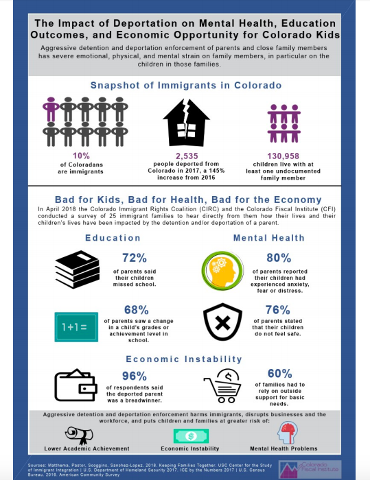 “Immigrant families are an important part of Colorado, and continued separation of families will hurt the state economically,” says Colorado Fiscal Institute policy analyst Esther Turcios. “From an additional $7 million from our already underfunded school districts to hire more school psychologists, to nearly $150 million in projected increased mental health care costs for children of deported or detained parents, Colorado can afford neither the financial nor the social impacts of aggressive detention and deportation policies.”