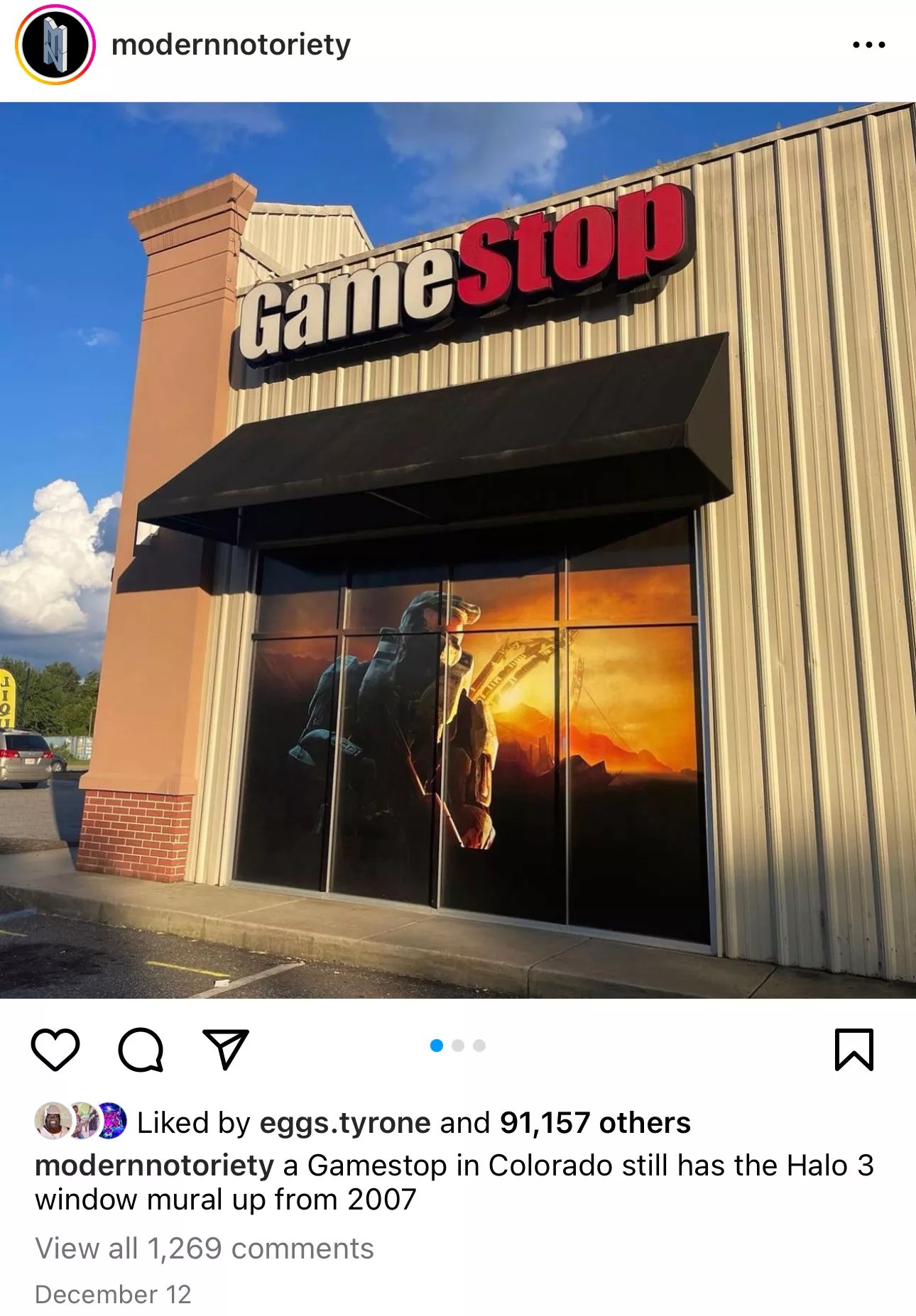 This Gamestop in Colorado still has the Halo 3 (2007) window mural up. pic.twitter.com/DeqXajxRXC