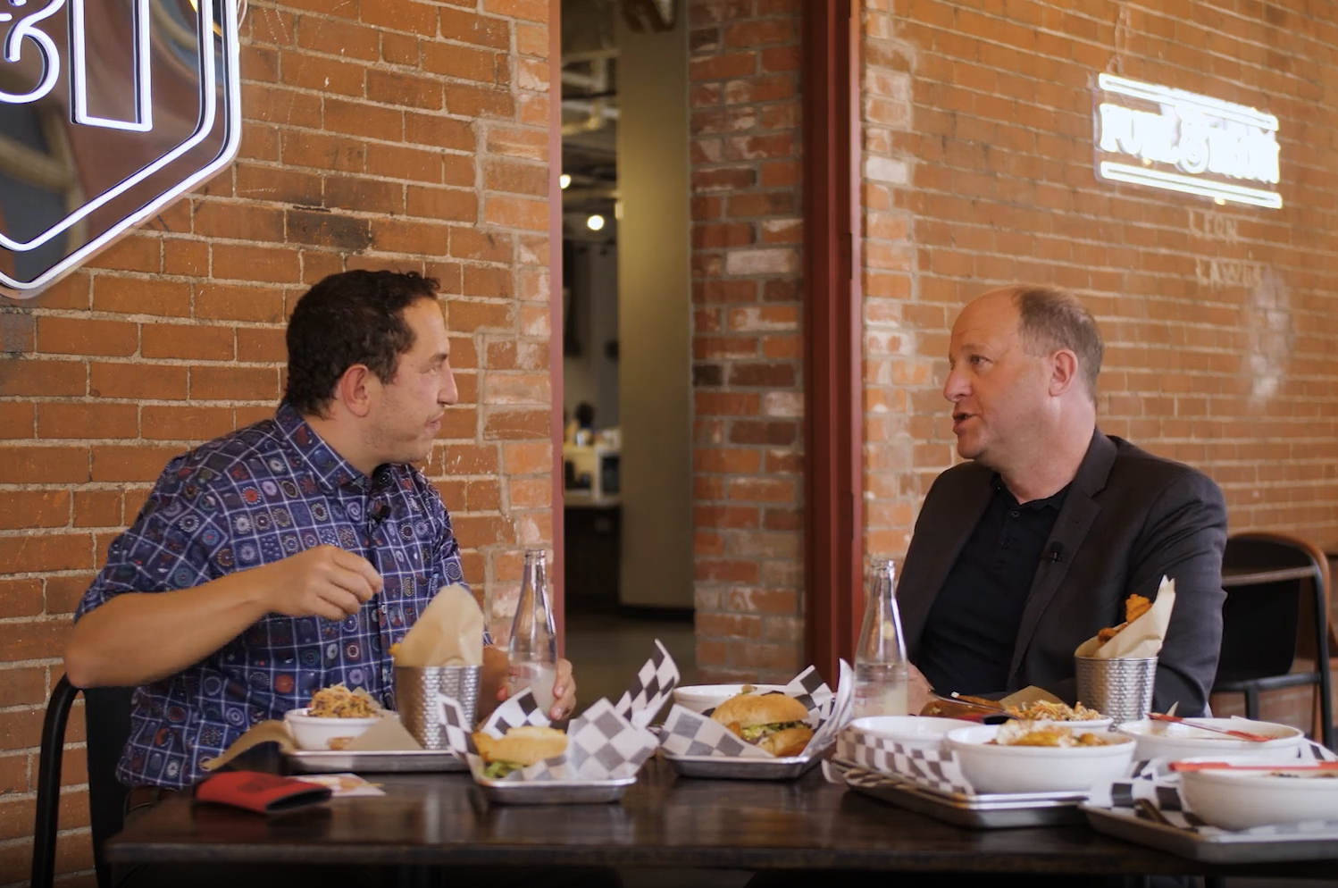 The Bloomberg Originals series features Heffner interviewing governors and U.S. senators from across the country — and across the political spectrum — while dining on their favorite foods. Polis brings the series to Pueblo’s Fuel & Iron Food Hall, where the pair chat about personal life and public policy over hot chicken sandwiches, roast beef, ramen and ice cream.