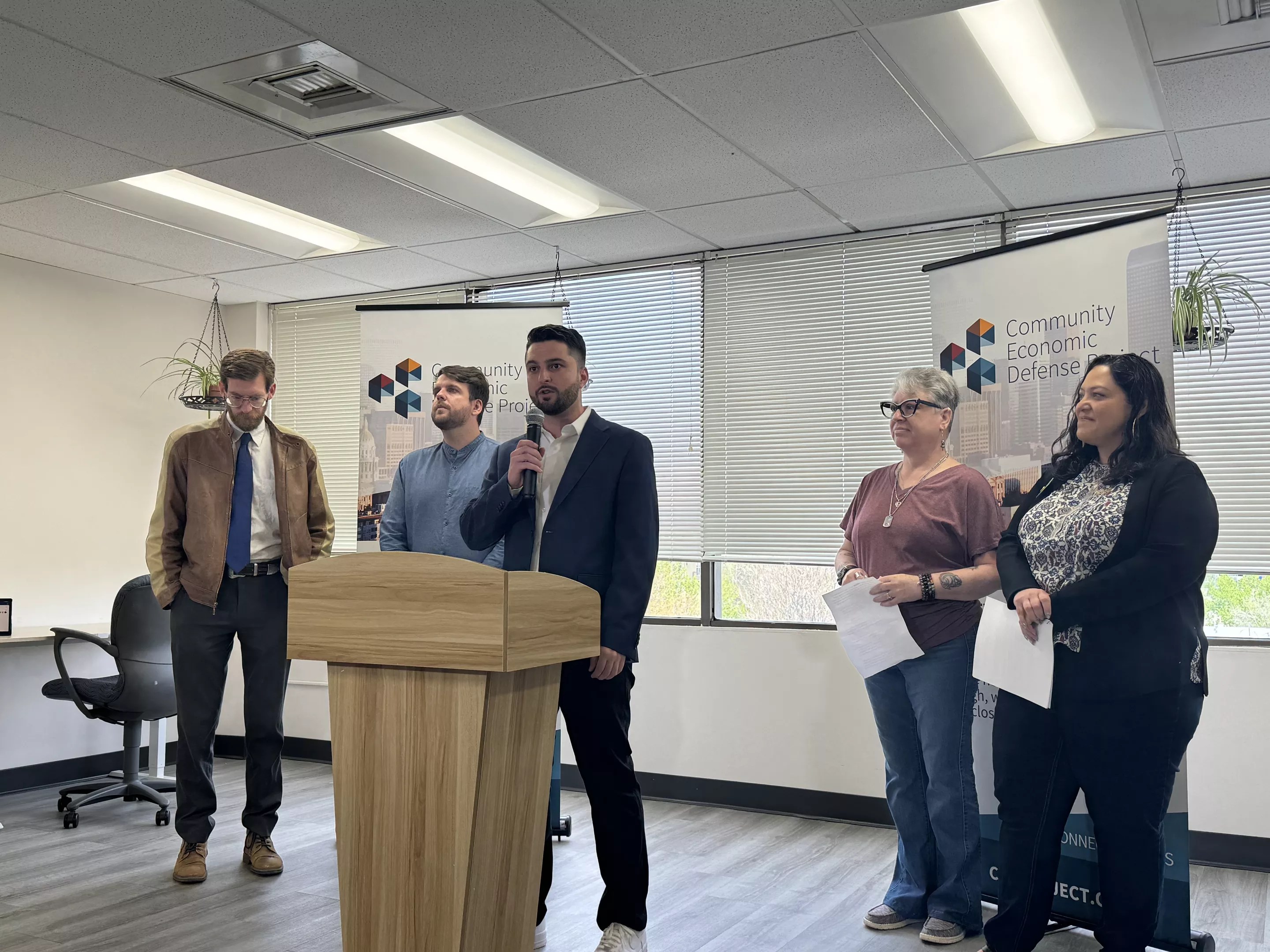 On May 9, three of the bill’s prime sponsors — State Representative Javier Mabrey and senators Julie Gonzales and Nick Hinrichsen — gathered at the office of the Community Economic Defense Project (CEDP) to encourage the governor to sign the bill.