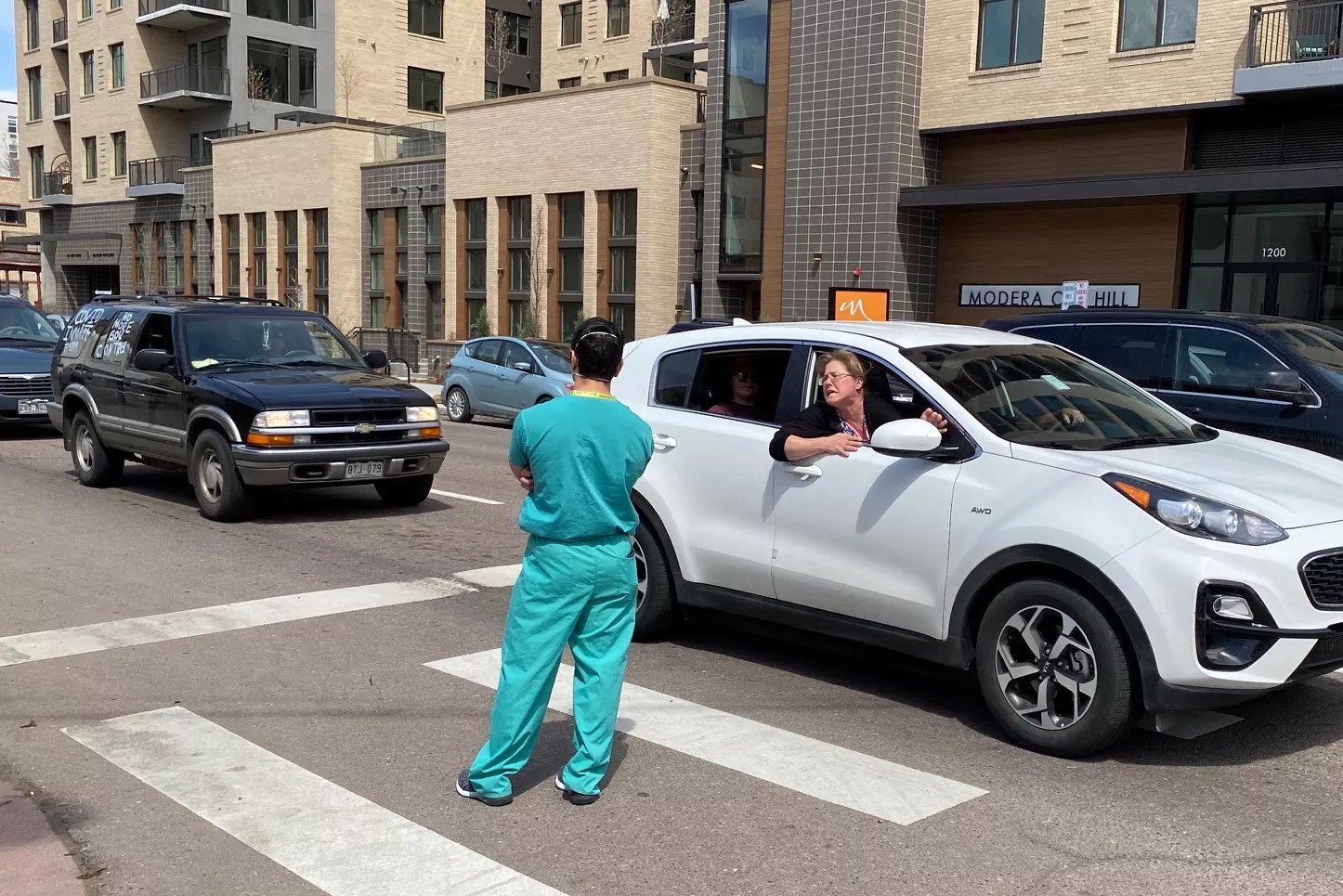 Westword was on the scene Sunday afternoon when the two workers, who declined to give their names or the name of the hospital where they work, stood in the crosswalk at 12th and Grant Streets during red lights, in what they said was an effort to remind anti-shutdown protesters of why strict social-distancing measures are in place.
