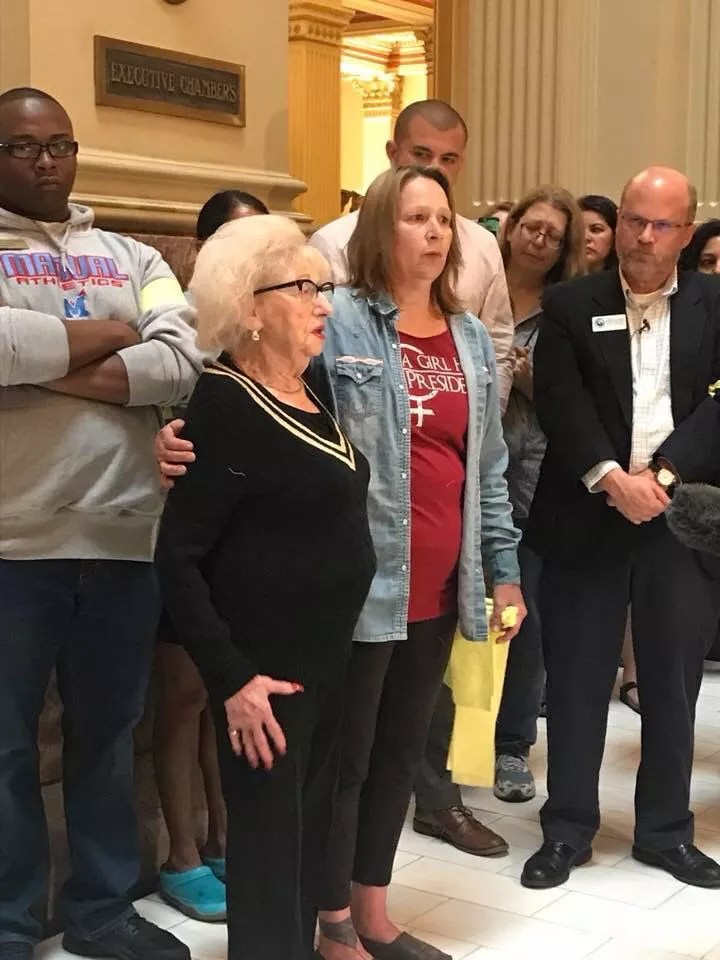 Fanny Starr, a 96-year-old Holocaust survivor, speaks out against family separation at a protest held Monday at the State Capitol.