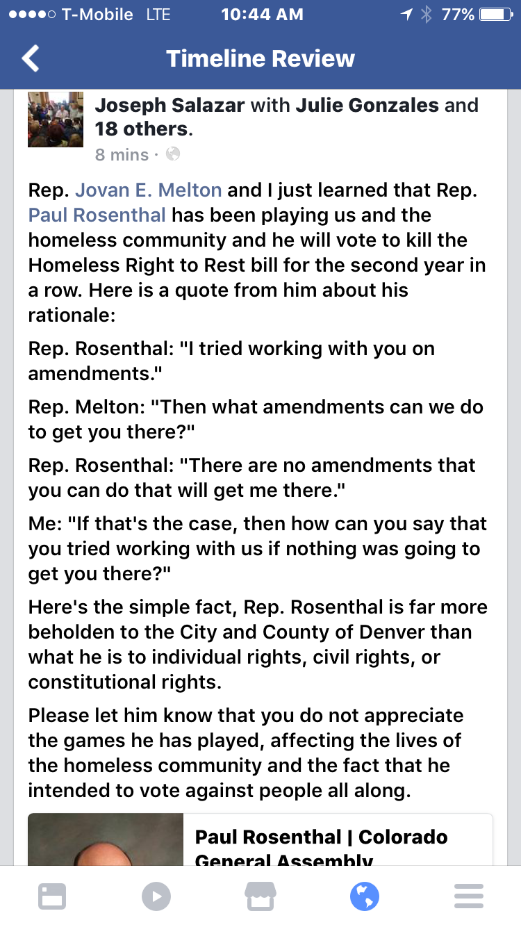 Rosenthal grilled the bill sponsors yesterday on whether cities could still displace people when they encumbered a public right-of-way (“Yes,” Melton and Salazar replied) and why a home-rule city like Denver couldn’t enact something like Right to Rest on its own.