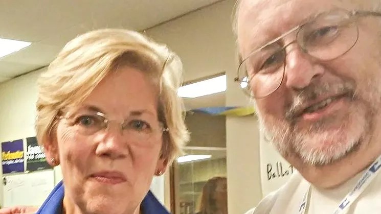 Senator and presidential candidate Elizabeth Warren was among the politicians who weighed in on behalf of Dennis Obduskey, right.