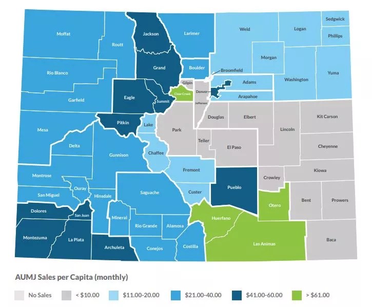 If you want to avoid weed (or avoid places that don’t have weed), then consider the image above, a state map of recreational marijuana sales per capita by county. While several of the counties in gray do have dispensaries, such low sales figures indicate that dispensaries are few and far between in southeastern Colorado.