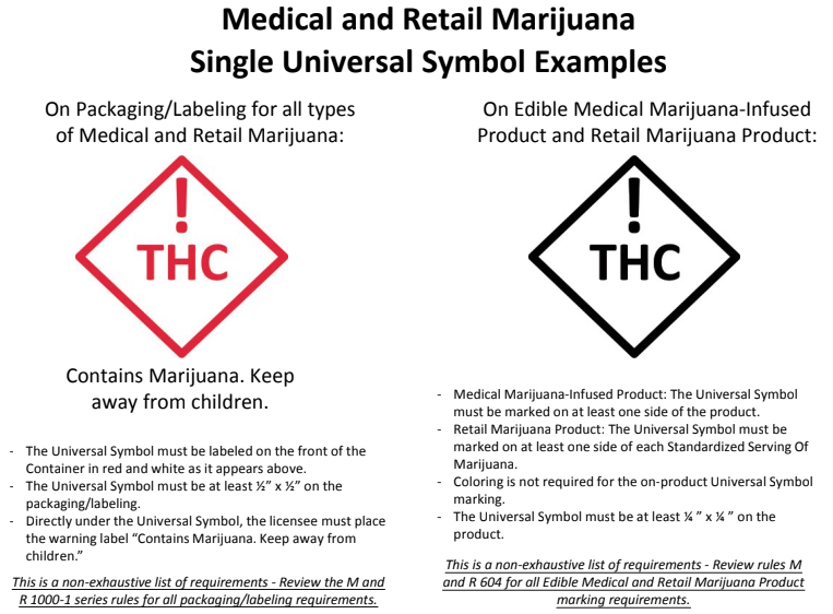 Previous packaging rules required that all retail pot products bear a single universal symbol. The new rules require that medical products carry the same “THC” symbol inside a red diamond, but now infused products must carry an additional symbol, too.