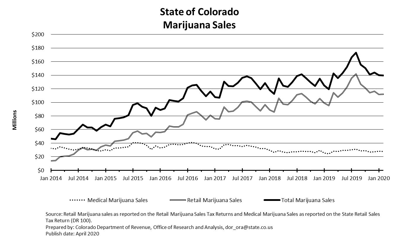 Combined dispensary sales from January and February hit $279.6 million, DOR data shows, easily the highest sales total for the first two months of the year since 2014, the first year of recreational pot sales in Colorado. But then the COVID-19 pandemic hit the state in March, and its impact on pot sales has yet to be reported by the DOR.